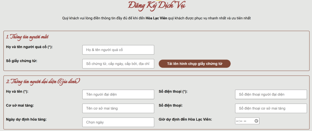 – Nhập đầy đủ thông tin họ và tên người quá cố, họ và tên người đại diện và số điện thoại người đại diện.