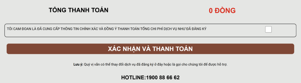 Kiểm tra thông tin đã điền và chọn mục cam đoan cung cấp thông tin. Bấm nút xác nhận và thanh toán.
